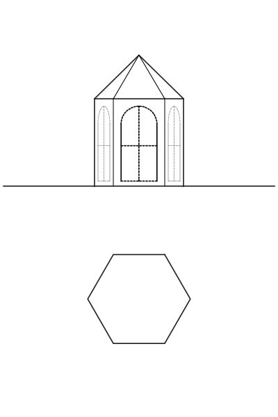 六角形の平面の屋根です。屋根勾配が45度の六角錐の屋根のインスタントハウスとなります。