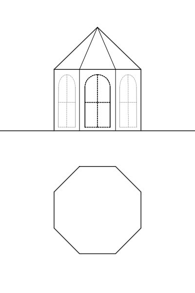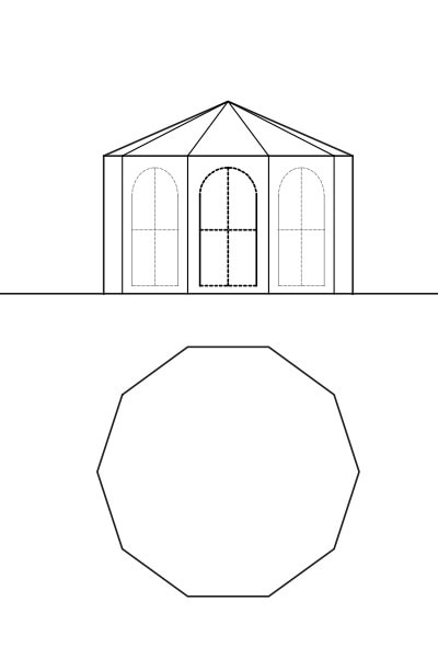 八角形〜十角形の平面の屋根です。屋根勾配が45度の八角錐のインスタントハウスや、緩勾配の十角錐のインスタントハウスとなります。