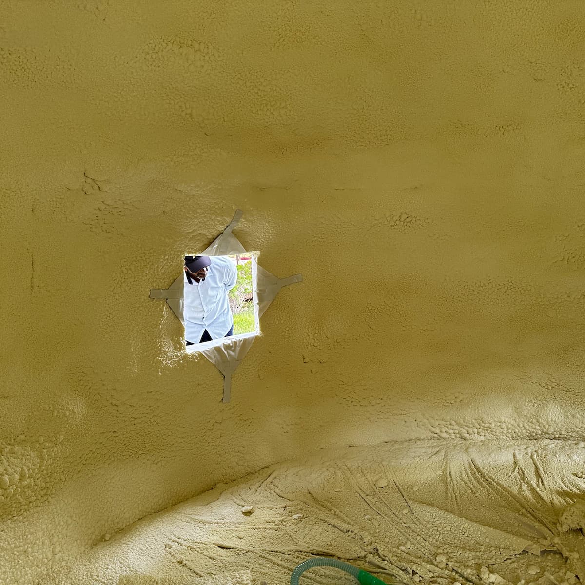 内側に入って、膨らませた膜に向けて、上下左右に、まんべんなく断熱材を吹き付けます。